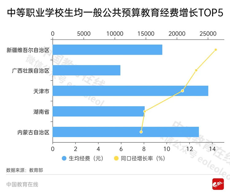全國(guó)中等職業(yè)學(xué)校為17095.26元,同口徑比上年增長(zhǎng)0.58%。各省區(qū)市中,增長(zhǎng)最快的是新疆維吾爾自治區(qū)(14.31%)。其次為廣西壯族自治區(qū)(12.6%)、天津市(11.4%)、湖南省(8.09%)、內(nèi)蒙古自治區(qū)(7.77%)。