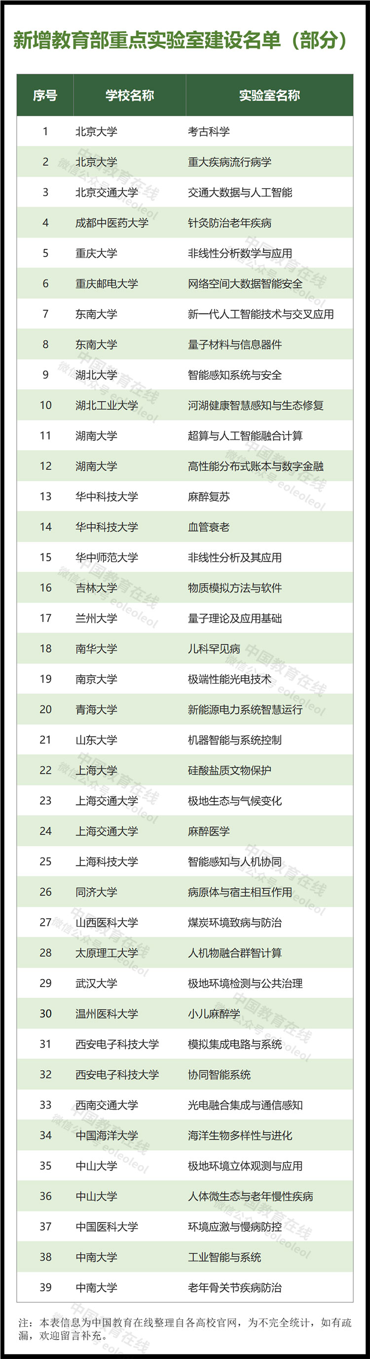 其中,北京大學、湖南大學、華中科技大學、上海交通大學、山東大學、同濟大學、西安電子科技大學、中南大學、中山大學等高校分別獲批2個教育部重點實驗室。