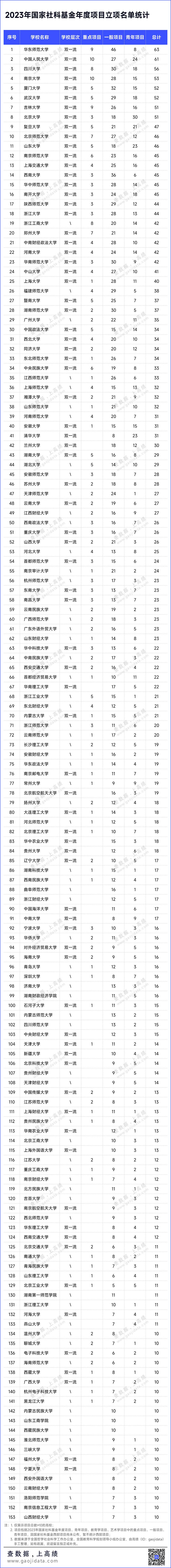 國家社科基金項(xiàng)目是目前我國唯一的國家級人文社科類研究項(xiàng)目,代表了人文社會科學(xué)的國家水準(zhǔn),是衡量一個單位科研生產(chǎn)力的重要指標(biāo)。下面匯總了2023年國家社科基金年度項(xiàng)目、青年項(xiàng)目和教育學(xué)、藝術(shù)學(xué)兩個單列學(xué)科項(xiàng)目,一起來看看誰是人文社科領(lǐng)域的領(lǐng)頭羊。