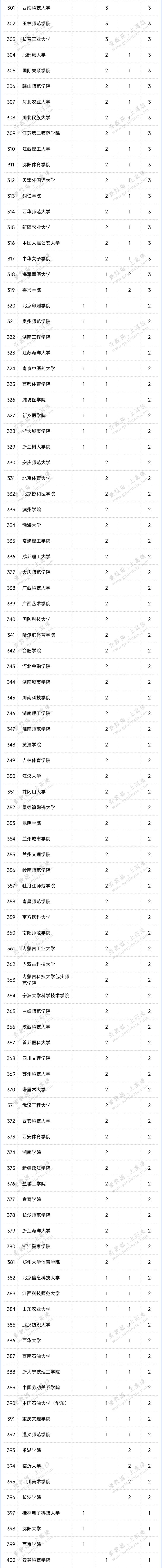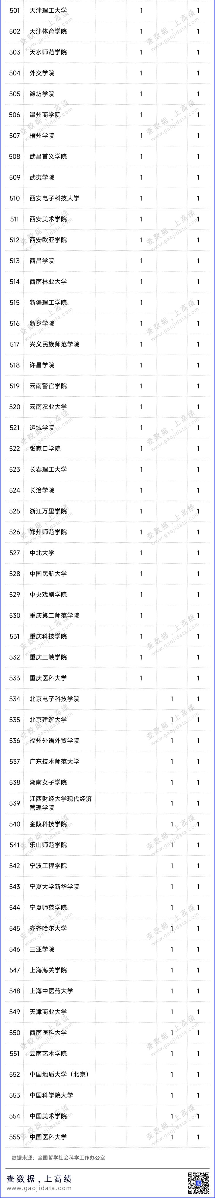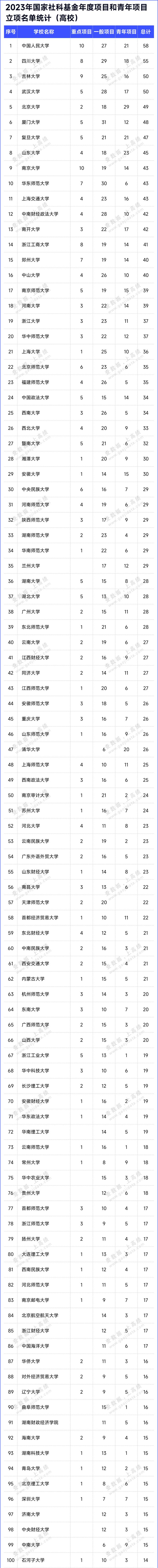 據(jù)統(tǒng)計,共有555所高校入選。中國人民大學(xué)以58項的立項數(shù)位居榜首,四川大學(xué)以立項數(shù)55項位居全國第二位,吉林大學(xué)和武漢大學(xué)以50項的立項數(shù)并列第三。北京大學(xué)、廈門大學(xué)、復(fù)旦大學(xué)、山東大學(xué)、南京大學(xué)、華東師范大學(xué)、上海交通大學(xué)、中南財經(jīng)政法大學(xué)、南開大學(xué)、浙江工商大學(xué)、鄭州大學(xué)和中山大學(xué)等高校的立項數(shù)在40項以上。