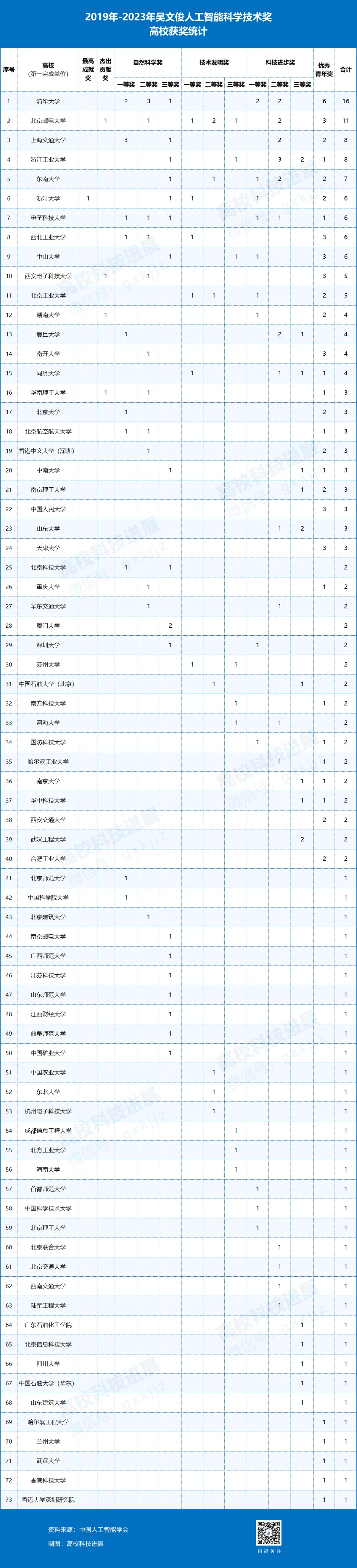 中國工程院院士、浙江大學(xué)計(jì)算機(jī)學(xué)院潘云鶴教授獲得2021年度第十一屆吳文俊人工智能最高成就獎(jiǎng);2019年~2023年期間,北京郵電大學(xué)、西安電子科技大學(xué)、湖南大學(xué)、華南理工大學(xué)均有1項(xiàng)摘得吳文俊人工智能杰出貢獻(xiàn)獎(jiǎng)。