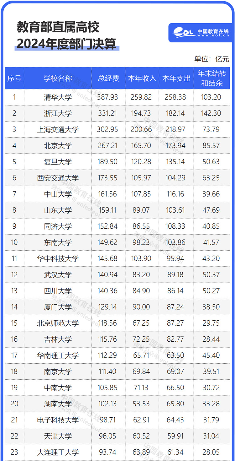 日前,75所教育部直屬高校官網(wǎng)均已公布2024年部門決算。據(jù)數(shù)據(jù)顯示,共有20所高??偨?jīng)費(fèi)過百億。