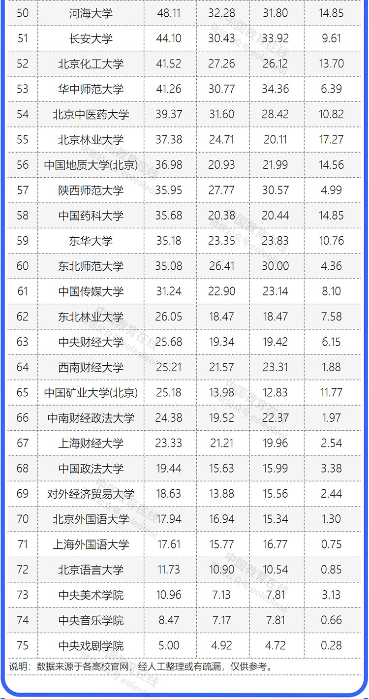 說明:本文統(tǒng)計(jì)中,華北電力大學(xué)經(jīng)費(fèi)為北京校區(qū)和保定校區(qū)合計(jì),哈爾濱工業(yè)大學(xué)、北京航空航天大學(xué)、西北工業(yè)大學(xué)等工信部直屬高校以及國科大、中科大等中國科學(xué)院直屬高校以及其他部委院校不在本文的統(tǒng)計(jì)范圍之內(nèi)。