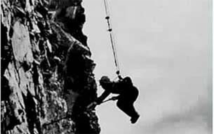 施工時,戰(zhàn)士們系著一條安全繩,懸在半空,排除碎石,腳下是萬丈深淵。