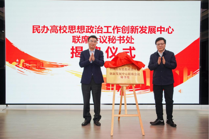教育部思政司副司長(zhǎng)余先亭和上海市教衛(wèi)工作黨委副書記、上海市教委副主任、上海市民辦高校黨工委書記閔輝為民辦高校思政工作創(chuàng)新發(fā)展中心聯(lián)席會(huì)議秘書處揭牌