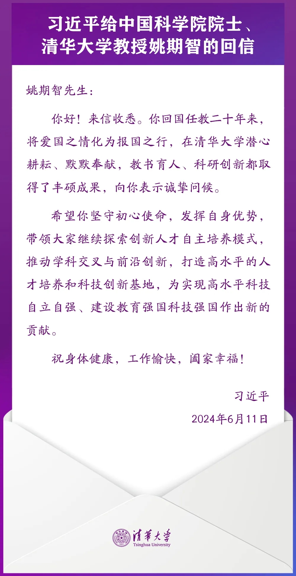 姚期智寄出了一封信。這封信寫給中共中央總書記、國家主席、中央軍委主席習(xí)近平,他匯報了自己回國任教20年來培養(yǎng)人才、科研創(chuàng)新等情況,表達(dá)了科技報國、為實現(xiàn)中華民族偉大復(fù)興貢獻(xiàn)力量的決心。6月11日下午,正在辦公室工作的他,收到了習(xí)近平總書記的回信,向他致以誠摯問候并提出殷切希望。