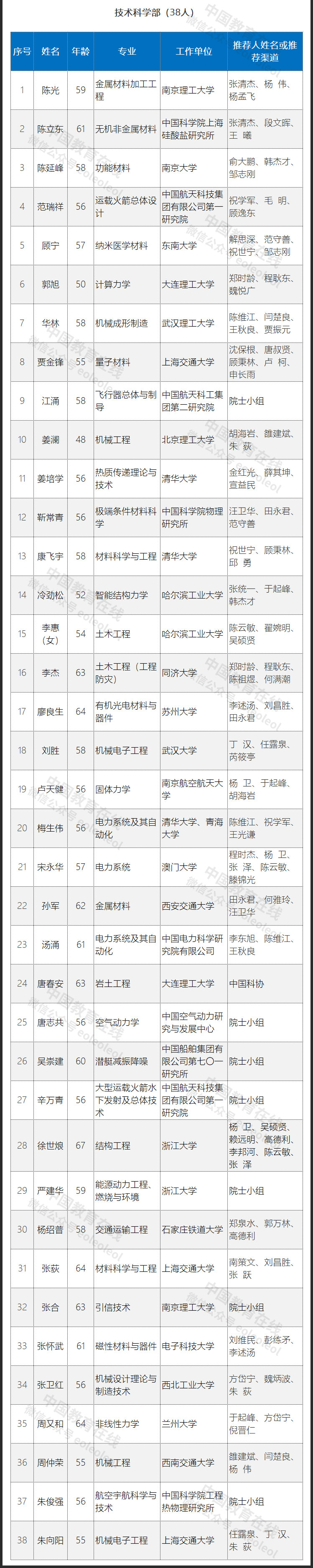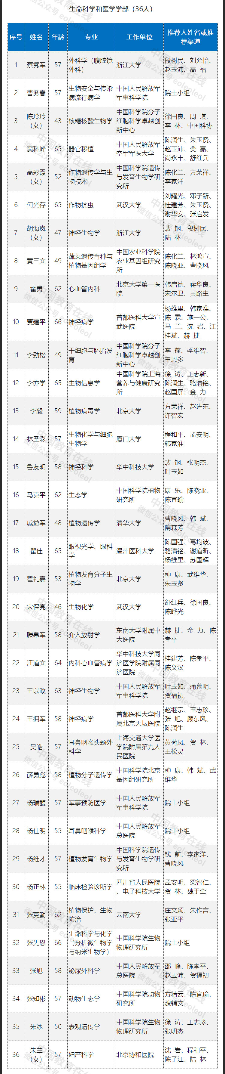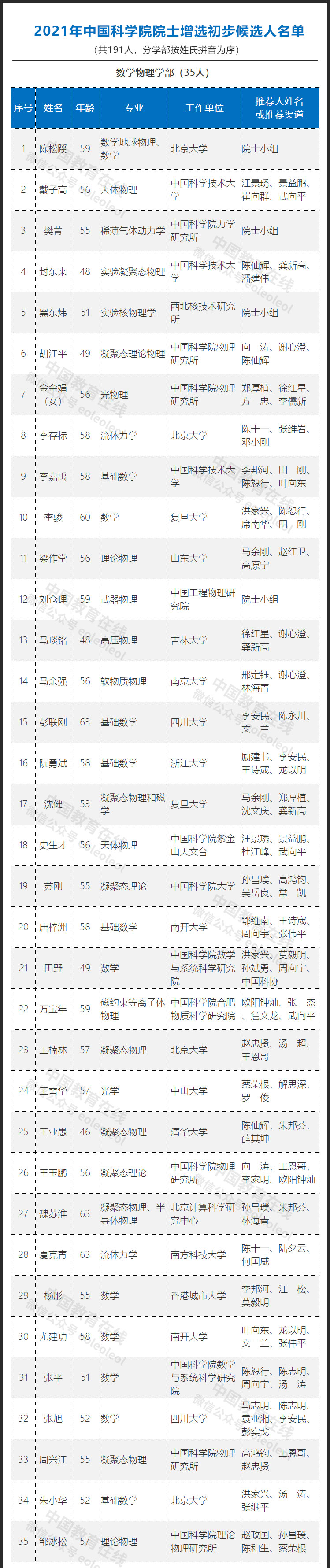 此次入圍的初步候選人共計191人,其中數(shù)學物理學部35人,化學部29人,生命科學和醫(yī)學學部36人,地學部27人,信息技術(shù)科學部26人,技術(shù)科學部38人。具體名單如下: