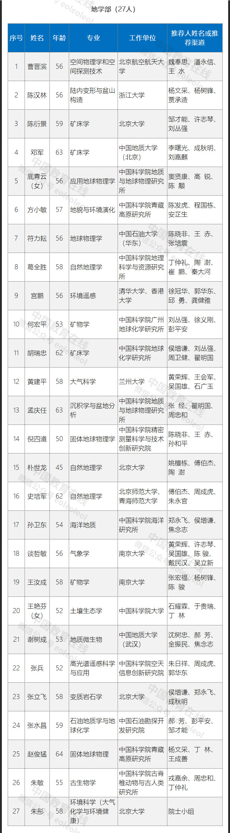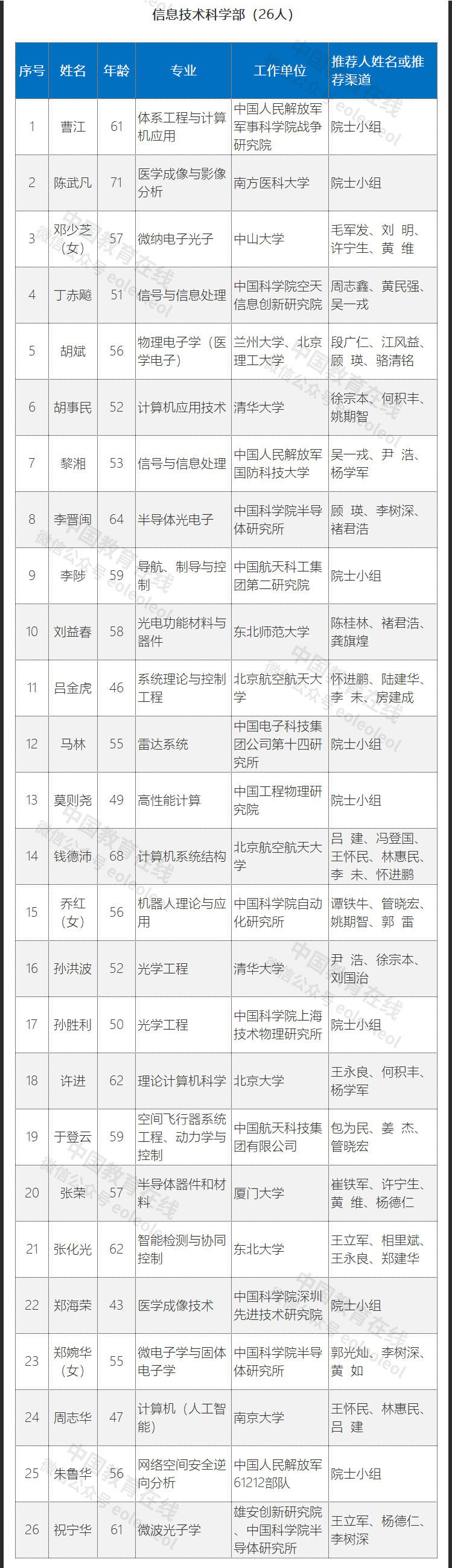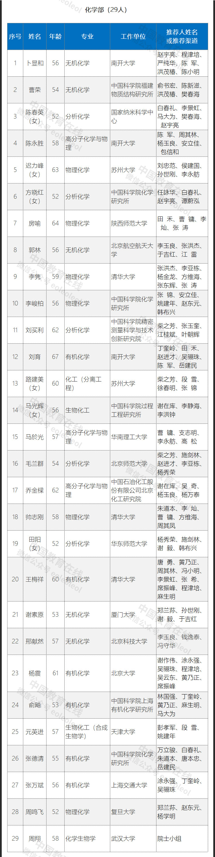 此次入圍的初步候選人共計191人,其中數(shù)學物理學部35人,化學部29人,生命科學和醫(yī)學學部36人,地學部27人,信息技術(shù)科學部26人,技術(shù)科學部38人。具體名單如下: