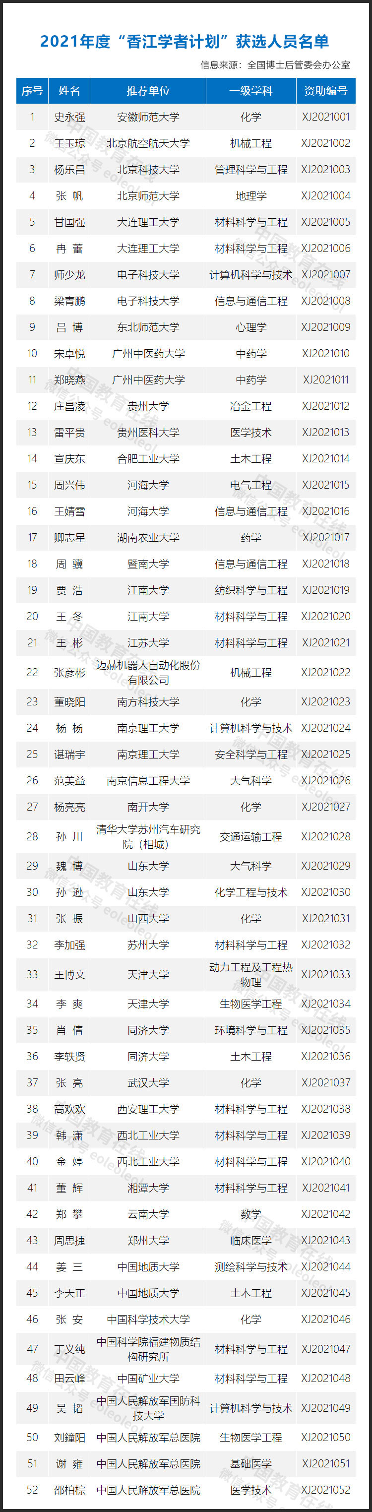 根據(jù)《全國(guó)博士后管委會(huì)辦公室與香港學(xué)者協(xié)會(huì)聯(lián)合培養(yǎng)博士后研究人員計(jì)劃協(xié)議書》的規(guī)定,全國(guó)博士后管委會(huì)辦公室和香港學(xué)者協(xié)會(huì)分別于今年5月和7月在北京和香港組織專家對(duì)2021年度“香江學(xué)者計(jì)劃”申請(qǐng)者進(jìn)行評(píng)審,最終確定52名獲選人員(名單見附件)。