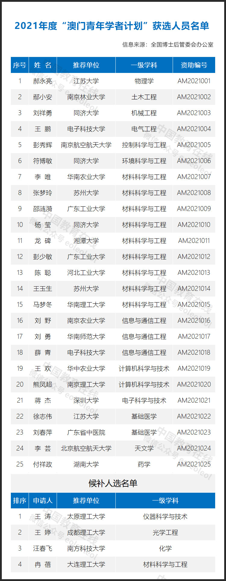 2021年度“澳門青年學(xué)者計(jì)劃”獲選人員名單: