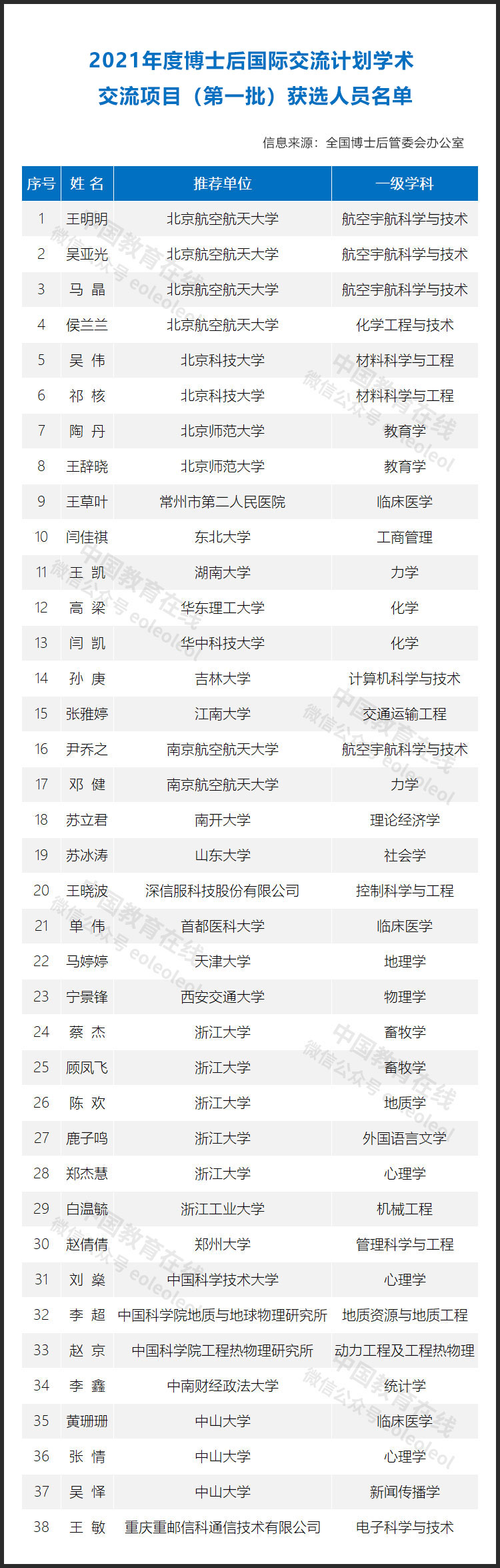 2021年度博士后國(guó)際交流計(jì)劃學(xué)術(shù)交流項(xiàng)目(第一批)的獲選名單: