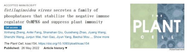 中國農(nóng)業(yè)大學(xué)植物保護(hù)學(xué)院孫文獻(xiàn)教授團(tuán)隊在《植物細(xì)胞》(The Plant Cell)在線發(fā)表了題為《稻曲病菌效應(yīng)因子SCRE6作為新型酪氨酸磷酸酶穩(wěn)定免疫負(fù)調(diào)控因子OsMPK6以抑制水稻免疫》(Ustilaginoideavirens secretes a family of phosphatases that stabilize the negative immune regulator OsMPK6 and suppress plant immunity)的研究論文,揭示了稻曲病菌中的一種新型致病機制,其分泌一類酪氨酸蛋白磷酸酶,通過去磷酸化穩(wěn)定水稻免疫負(fù)調(diào)控因子OsMPK6并抑制水稻免疫。同期的《植物細(xì)胞》(The Plant Cell)發(fā)表了Judith Van Dingenen題為《毒力效應(yīng)因子致病新機制:真菌磷酸酶效應(yīng)因子如何突破寄主免疫促進(jìn)稻曲病菌侵染》(A virulence effector resolved: how a fungal phosphatase effector promotes rice false smut)的評論文章。