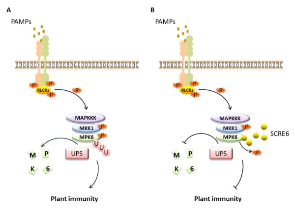 該研究以稻曲病菌富含半胱氨酸蛋白SCRE6為研究對象,證實了SCRE6是稻曲病菌中發(fā)揮重要毒性功能的效應(yīng)蛋白;通過生化實驗揭示了SCRE6是一個以水稻免疫負(fù)調(diào)控因子OsMPK6(Mitogen-Activated Protein Kinase 6)為靶標(biāo)的酪氨酸蛋白磷酸酶。當(dāng)病原菌侵染時,水稻識別PAMP后誘導(dǎo)OsMPK6的磷酸化,促進(jìn)其通過26S蛋白酶體途徑降解而激活水稻抗病性。而稻曲病菌分泌的SCRE6能特異性去磷酸化OsMPK6,進(jìn)而抑制OsMPK6降解,該蛋白積累促進(jìn)稻曲病菌的侵染;此外,在稻曲病菌中還發(fā)現(xiàn)3個SCRE6同源蛋白,與SCRE6構(gòu)成一類新型酪氨酸蛋白磷酸酶家族。該研究揭示了稻曲病菌致病的新機制,并為通過基因編輯技術(shù)創(chuàng)制水稻抗病新種質(zhì)提供了思路。