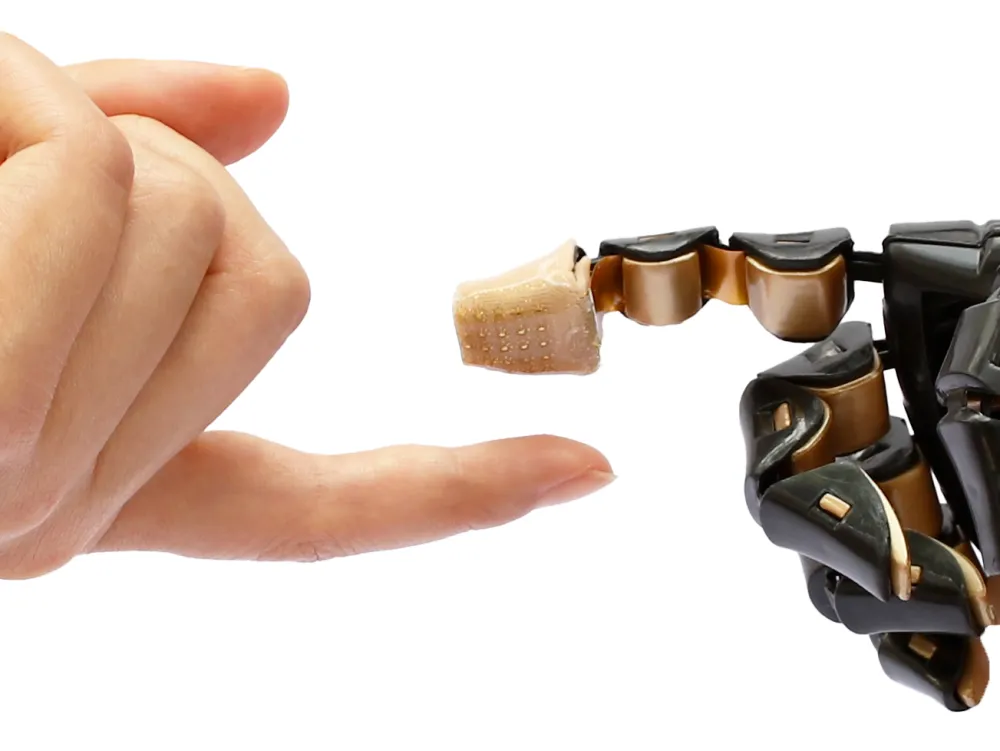 圖為裝有仿生三維電子皮膚的機(jī)械手與人手互動(dòng)。(受訪者供圖)