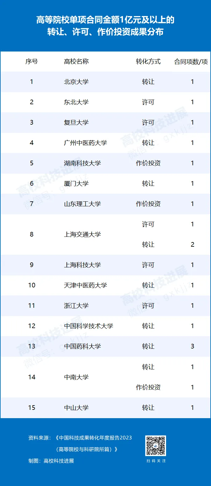 15所高校20項合同,單項合同金額超1億元(以轉(zhuǎn)讓、許可、作價投資方式)