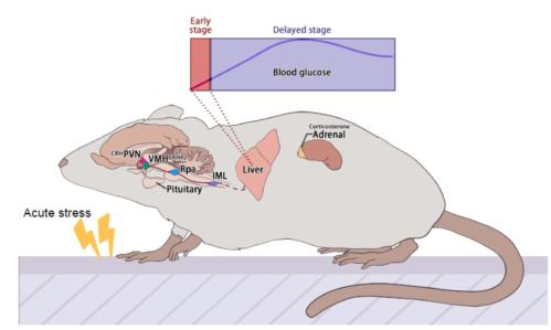 應(yīng)激反應(yīng)是動物在處理威脅時作出的本能反應(yīng),其中包括血糖快速上升來應(yīng)對潛在的危險。經(jīng)典的理論認為,應(yīng)激血糖的產(chǎn)生是通過經(jīng)典的下丘腦-垂體-腎上腺軸或者自主神經(jīng)-腎上腺軸來刺激應(yīng)激激素響應(yīng)能量供應(yīng),但這兩條通路均需要腎上腺介導(dǎo),且在時間上有明顯的延遲,不符合應(yīng)激過程快速釋放血糖的生理需求。