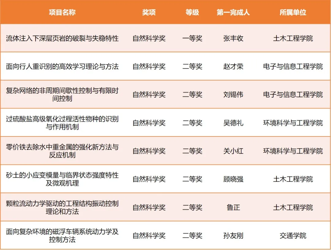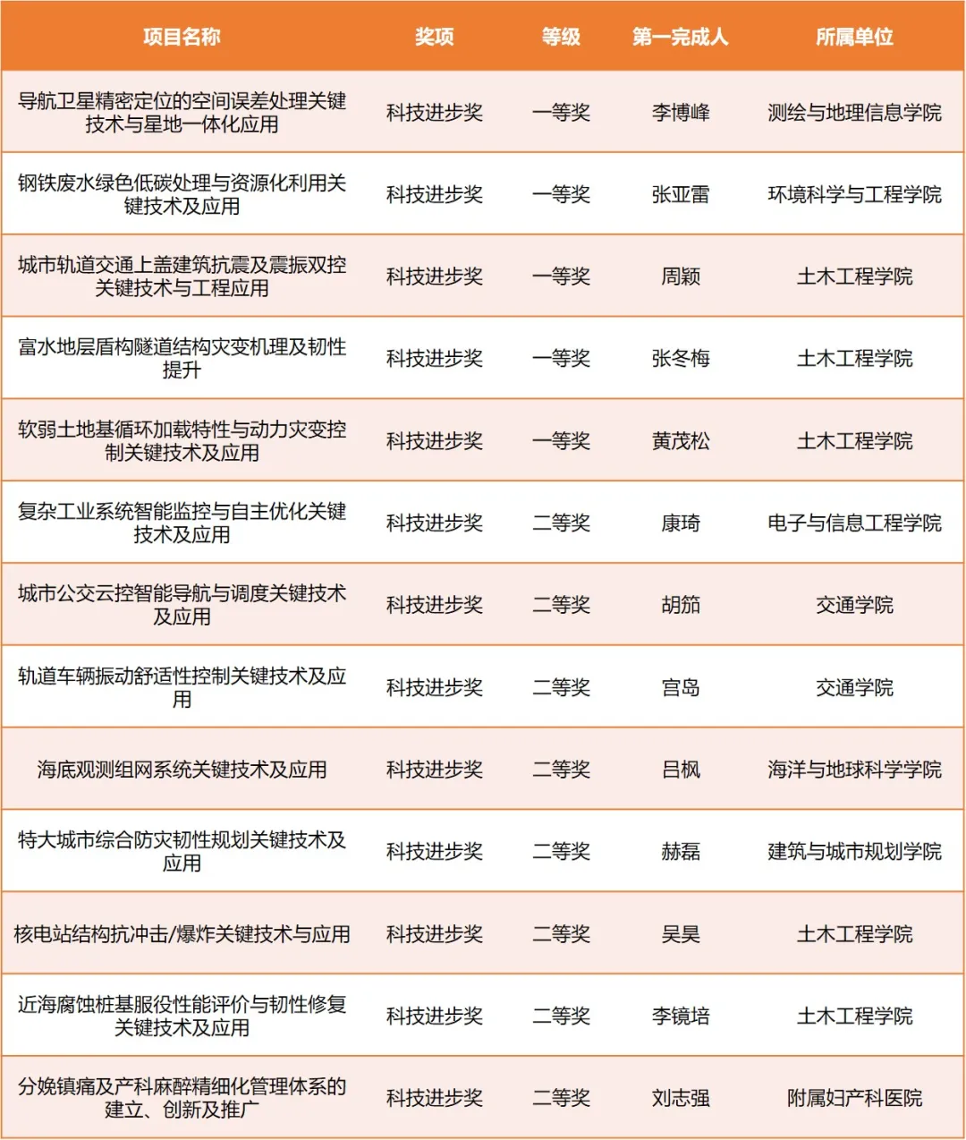 獲科技進(jìn)步獎(jiǎng)13項(xiàng),其中一等獎(jiǎng)5項(xiàng),分別是測繪與地理信息學(xué)院李博峰主持完成的“導(dǎo)航衛(wèi)星精密定位的空間誤差處理關(guān)鍵技術(shù)與星地一體化應(yīng)用”、環(huán)境科學(xué)與工程學(xué)院張亞雷主持完成的“鋼鐵廢水綠色低碳處理與資源化利用關(guān)鍵技術(shù)及應(yīng)用”、土木工程學(xué)院周穎主持完成的“城市軌道交通上蓋建筑抗震及震振雙控關(guān)鍵技術(shù)與工程應(yīng)用”、土木工程學(xué)院張冬梅主持完成的“富水地層盾構(gòu)隧道結(jié)構(gòu)災(zāi)變機(jī)理及韌性提升”、土木工程學(xué)院黃茂松主持完成的“軟弱土地基循環(huán)加載特性與動力災(zāi)變控制關(guān)鍵技術(shù)及應(yīng)用”。