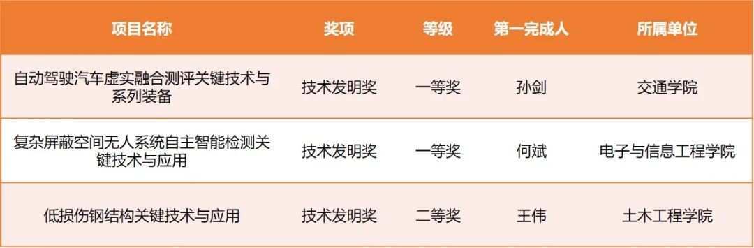 獲技術(shù)發(fā)明獎(jiǎng)3項(xiàng),其中一等獎(jiǎng)2項(xiàng),分別是交通學(xué)院孫劍主持完成的“自動駕駛汽車虛實(shí)融合測評關(guān)鍵技術(shù)與系列裝備”、電子與信息工程學(xué)院何斌主持完成的“復(fù)雜屏蔽空間無人系統(tǒng)自主智能檢測關(guān)鍵技術(shù)與應(yīng)用”。