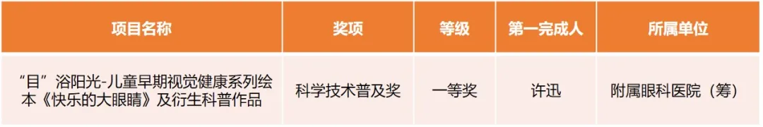 獲科學(xué)技術(shù)普及獎(jiǎng)一等獎(jiǎng)1項(xiàng),為附屬眼科醫(yī)院(籌)許迅主持完成的“‘目’浴陽光-兒童早期視覺健康系列繪本《快樂的大眼睛》及衍生科普作品”。