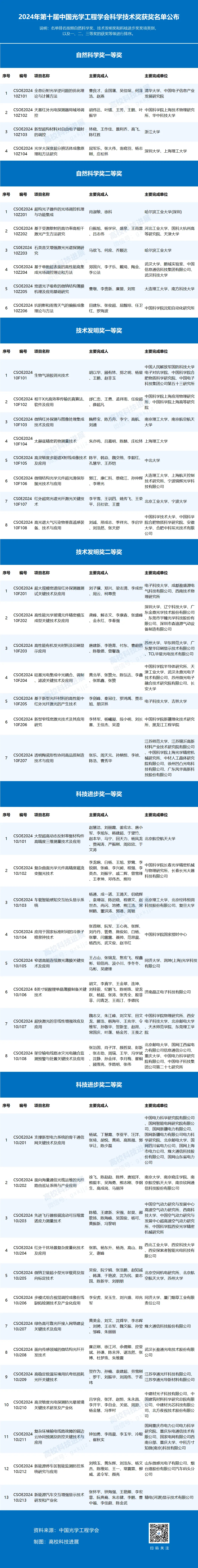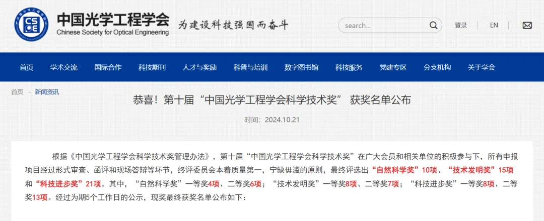 日前,2024年第十屆中國光學(xué)工程學(xué)會(huì)科學(xué)技術(shù)獎(jiǎng)獲獎(jiǎng)名單正式公布,最終評(píng)選出“自然科學(xué)獎(jiǎng)”10項(xiàng)、“技術(shù)發(fā)明獎(jiǎng)”15項(xiàng)和“科技進(jìn)步獎(jiǎng)”21項(xiàng)。其中,“自然科學(xué)獎(jiǎng)”一等獎(jiǎng)4項(xiàng)、二等獎(jiǎng)6項(xiàng);“技術(shù)發(fā)明獎(jiǎng)”一等獎(jiǎng)8項(xiàng)、二等獎(jiǎng)7項(xiàng);“科技進(jìn)步獎(jiǎng)”一等獎(jiǎng)8項(xiàng)、二等獎(jiǎng)13項(xiàng)。