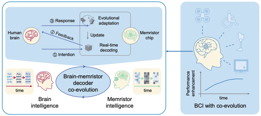 “這項(xiàng)研究首次提出了腦機(jī)協(xié)同演進(jìn)的概念,并基于憶阻器神經(jīng)形態(tài)器件完成了技術(shù)驗(yàn)證,通過(guò)長(zhǎng)時(shí)程大腦與憶阻器神經(jīng)形態(tài)器件之間的信息交互初步實(shí)現(xiàn)了生物智能與機(jī)器智能的互適應(yīng)、互學(xué)習(xí),為未來(lái)實(shí)用型腦機(jī)接口系統(tǒng)提供了重要的理論基礎(chǔ)與技術(shù)支撐,也為腦機(jī)融合智能的發(fā)展開辟了新的方向。”國(guó)家高層次人才計(jì)劃入選者、天津大學(xué)腦機(jī)海河實(shí)驗(yàn)室許敏鵬教授表示?!拔覀冞@款系統(tǒng)未來(lái)計(jì)劃拓展到更多便攜式或可穿戴腦機(jī)接口設(shè)備中,服務(wù)于消費(fèi)級(jí)、醫(yī)療級(jí)等各類智能人機(jī)交互實(shí)用場(chǎng)景?!?/p>