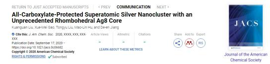 近日,寧夏大學寧夏光伏材料重點實驗室劉寬冠副教授團隊在銀納米團簇化學研究領域取得重要科研進展。劉寬冠以第一作者兼通訊作者在化學領域國際頂尖期刊《Journal of the American Chemical Society》(美國化學會志,以下簡稱JACS)上發(fā)表了題為“All-Carboxylate-Protected Superatomic Silver Nanocluster with an Unprecedented Rhombohedral Ag8 Core”的研究論文,寧夏大學為第一單位。
