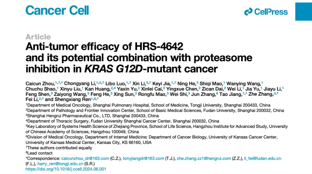 醫(yī)學院、附屬上海市肺科醫(yī)院任勝祥、周彩存團隊研發(fā)了首個臨床有效KRAS G12D特異性抑制劑——HRS-4642,通過體內(nèi)外聯(lián)合給藥實驗明確了其與蛋白酶體抑制劑聯(lián)合的治療新策略。研究團隊還通過流式細胞術(shù)、免疫組化等發(fā)現(xiàn)了HRS-4642單藥或聯(lián)合治療效用,為KRAS G12D腫瘤靶免聯(lián)合提供了理論基礎(chǔ)。該研究成果發(fā)表于《癌細胞》(Cancer Cell)。