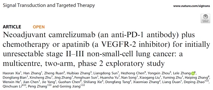 肺癌是全球發(fā)病和死亡人數(shù)最多的惡性腫瘤,其中非小細胞肺癌占比約85%。醫(yī)學院、附屬上海市肺科醫(yī)院胸外科姜格寧、張鵬團隊聯(lián)合市內(nèi)六家醫(yī)療單位共同開展了一項名為LungMate 003的多中心、雙臂、開放、Ⅱ期臨床研究,旨在探究新輔助卡瑞利珠單抗聯(lián)合化療或阿帕替尼治療初始不可切除非小細胞肺癌患者的安全性和有效性。該研究成果發(fā)表于《信號轉(zhuǎn)導與靶向治療》(Signal Transduction and Targeted Therapy)。