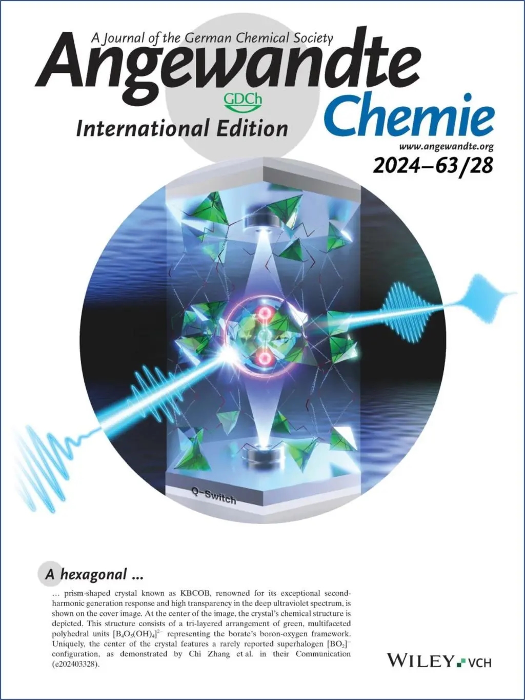 化學科學與工程學院張弛研究團隊以鹵代氧化物為研究對象,提出了一種超鹵素取代設(shè)計方法,研制了首例含有[BO2]基元的深紫外透過的氧化物晶體材料K9[B4O5(OH)4]3(CO3)(BO2)·7H2O (KBCOB),探討并闡明了多種π共軛陰離子基元對晶體材料光學帶隙、倍頻效應以及雙折射率的影響規(guī)律。相關(guān)成果發(fā)表于《德國應用化學》(Angewandte Chemie International Edition),并被遴選為封面文章。
