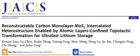 二維材料的插層結(jié)構(gòu)設(shè)計對發(fā)展快速充電鋰離子電池具有重要意義。化學科學與工程學院楊金虎與張弛團隊設(shè)計了一種單層碳插層在二硫化鉬范德華層間的異質(zhì)結(jié)構(gòu)材料,作為負極材料在鋰離子電池儲能過程中具有獨特的“原子層限域拓撲反應”和可逆重構(gòu)的特性,并展現(xiàn)出了超快充性能。相關(guān)研究成果發(fā)表于《美國化學會志》(Journal of the American Chemical Society)。