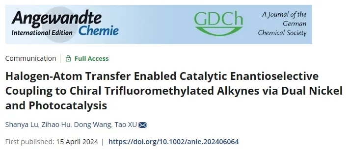 手性α-CF3炔烴化是一類非常重要的合成,在化學合成、藥物開發(fā)等領(lǐng)域有著獨特而顯著的作用?;瘜W科學與工程學院徐濤課題組利用鹵原子轉(zhuǎn)移策略實現(xiàn)手性α-CF3炔烴高效構(gòu)建的新方法,進一步證明了光鎳雙催化不對稱還原偶聯(lián)體系的優(yōu)勢,為后續(xù)實現(xiàn)醇的不對稱去氧偶聯(lián)反應奠定基礎(chǔ)。相關(guān)研究成果在線發(fā)表于《德國應用化學》(Angewandte Chemie International Edition)。