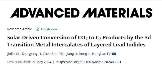 模仿自然界中的光合作用,利用人工合成的光催化劑將CO2光還原到高附加值的C2+化學品,具有重要的科學意義?;瘜W科學與工程學院費泓涵課題組通過配位組裝策略,將具有氧化還原活性的3d過渡金屬(Co2+/Ni2+)插層至準二維層狀配位型有機碘化鉛的相鄰層間,實現(xiàn)高選擇性光催化CO2得到C2產(chǎn)物。相關(guān)研究成果發(fā)表于《先進材料》(Advanced Materials)。