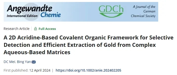 金作為最重要的金屬之一,在電子、航空航天和化學催化等重要領(lǐng)域都具有不可替代的地位。化學科學與工程學院閆冰團隊合成了一例亞胺鍵連接的吖啶基共價有機框架(COF)材料,該材料能夠作為新型探針實現(xiàn)對金離子的選擇性熒光傳感、比色傳感和高效的提取。相關(guān)研究成果在線發(fā)表于《德國應用化學》(Angewandte Chemie International Edition)。