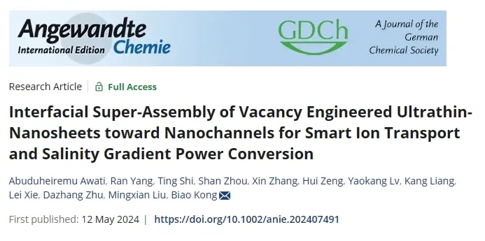 滲透能作為一種“藍色能源”,即利用淡水和含鹽水之間的離子濃度差異來獲取能量,被認為是解決能源危機和環(huán)境問題的潛在方案?;瘜W科學與工程學院劉明賢課題組提出了一種基于缺陷工程調(diào)控表面電荷策略,通過界面超組裝智能調(diào)控離子傳輸,實現(xiàn)了滲透能發(fā)電。近日,相關(guān)研究成果發(fā)表于《德國應用化學》(Angewandte Chemie International Edition)。