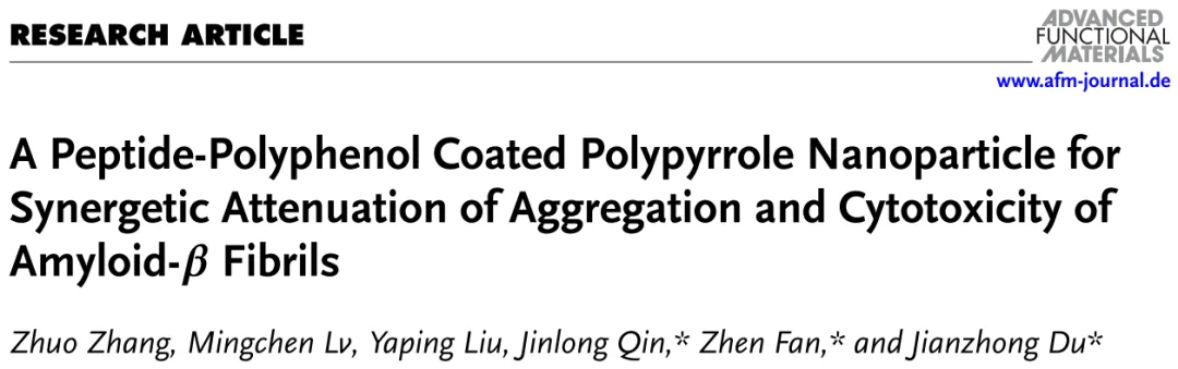 如何有效抑制大腦中β-淀粉樣蛋白(amyloid-β protein,Aβ)的聚集并解離已經(jīng)聚集的Aβ斑塊,是阿爾茨海默病治療領(lǐng)域的關(guān)鍵科學問題。材料科學與工程學院杜建忠/范震課題組設(shè)計并制備了一種具有多肽-多酚殼層的近紅外光響應性納米顆粒,能夠有效促進和加速Aβ纖維的解離。該研究成果發(fā)表于《先進功能材料》(Advanced Functional Materials)。