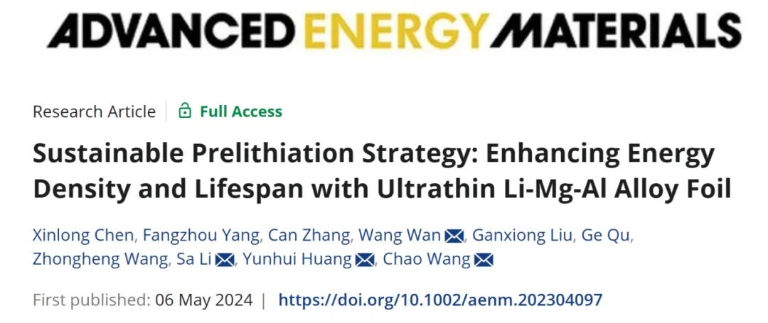 材料科學與工程學院王超團隊基于儲能型磷酸鐵鋰石墨電池體系,使用自制超薄鋰鎂鋁合金實現(xiàn)無損高效的接觸預鋰化,并提出了能夠不斷補充電池循環(huán)過程中鋰損失的持續(xù)補鋰設(shè)計原則。基于此方法,1000圈后電池容量提升了32.4%,電池預期循環(huán)壽命能延長至對照組的3倍。研究成果發(fā)表于《先進能源材料》(Advanced Energy Materials)。