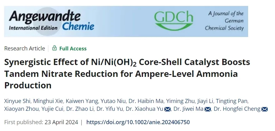 氨是重要的氮肥來源,也是清潔燃料。電催化硝酸鹽還原制氨被認為是最有望替代哈伯法的綠色制氨技術(shù),設(shè)計高活性和高選擇性的催化劑是實現(xiàn)高效電催化硝酸鹽制氨的關(guān)鍵。材料科學與工程學院程洪飛課題組合成了具備核殼異質(zhì)結(jié)構(gòu)的Ni/Ni(OH)2催化劑,實現(xiàn)了安培級電流密度的制氨。相關(guān)研究成果發(fā)表于《德國應用化學》(Angewandte Chemie International Edition)。