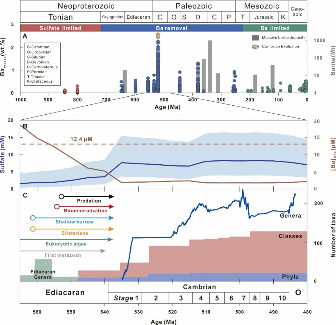 近期,衛(wèi)煒等人通過揚子板塊下寒武統(tǒng)富金屬頁巖的鋇同位素數(shù)據(jù)發(fā)現(xiàn),埃迪卡拉紀-寒武紀過渡時期海洋的逐漸氧化提升了硫酸根濃度,導致此前累積的溶解鋇離子以重晶石形式被大量移除。水體中高濃度的鋇會抑制水生動物的存活率,因此,對動物有毒害作用的硫化物和鋇離子的移除,改善了海洋的宜居性,促使了寒武紀生命大爆發(fā)。