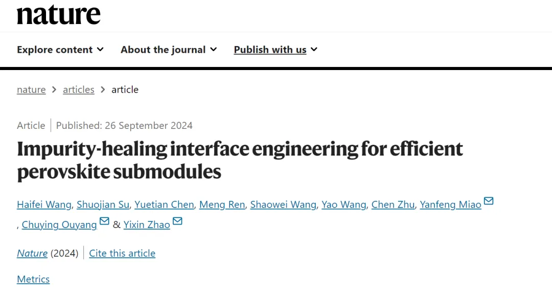 近日,上海交通大學(xué)環(huán)境科學(xué)與工程學(xué)院趙一新教授團(tuán)隊(duì)在Nature發(fā)表了題為“Impurity-healing interface engineering for efficient perovskite submodules”的研究論文。該工作設(shè)計開發(fā)了一種雜質(zhì)修復(fù)的界面工程新策略,解決了工業(yè)化大規(guī)模制備鈣鈦礦模組中面臨的大面積引發(fā)雜質(zhì)累積效應(yīng)的關(guān)鍵科學(xué)問題,并和寧德時代21C創(chuàng)新實(shí)驗(yàn)室合作,成功實(shí)現(xiàn)了光電轉(zhuǎn)換效率超過22%的30 cm × 30 cm大尺寸高性能鈣鈦礦光伏模組。