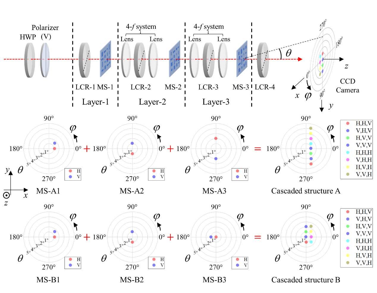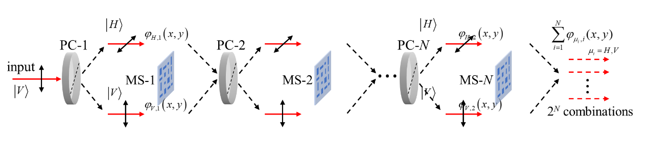 為了提升通道數(shù)量,研究團隊采用N個偏振相關(guān)超表面進行級聯(lián),同時在每個超表面前增加一個偏振控制器,使得該超表面的輸入光可在2個正交偏振態(tài)間切換。此時,整個級聯(lián)結(jié)構(gòu)中的光偏振態(tài)將具有2N種組合,對應(yīng)的等效波前操控模板也具有2N種情況。然而,這些模板間具有相關(guān)性,自由度僅為N+1,無法對應(yīng)2N個任意的功能進行設(shè)計。