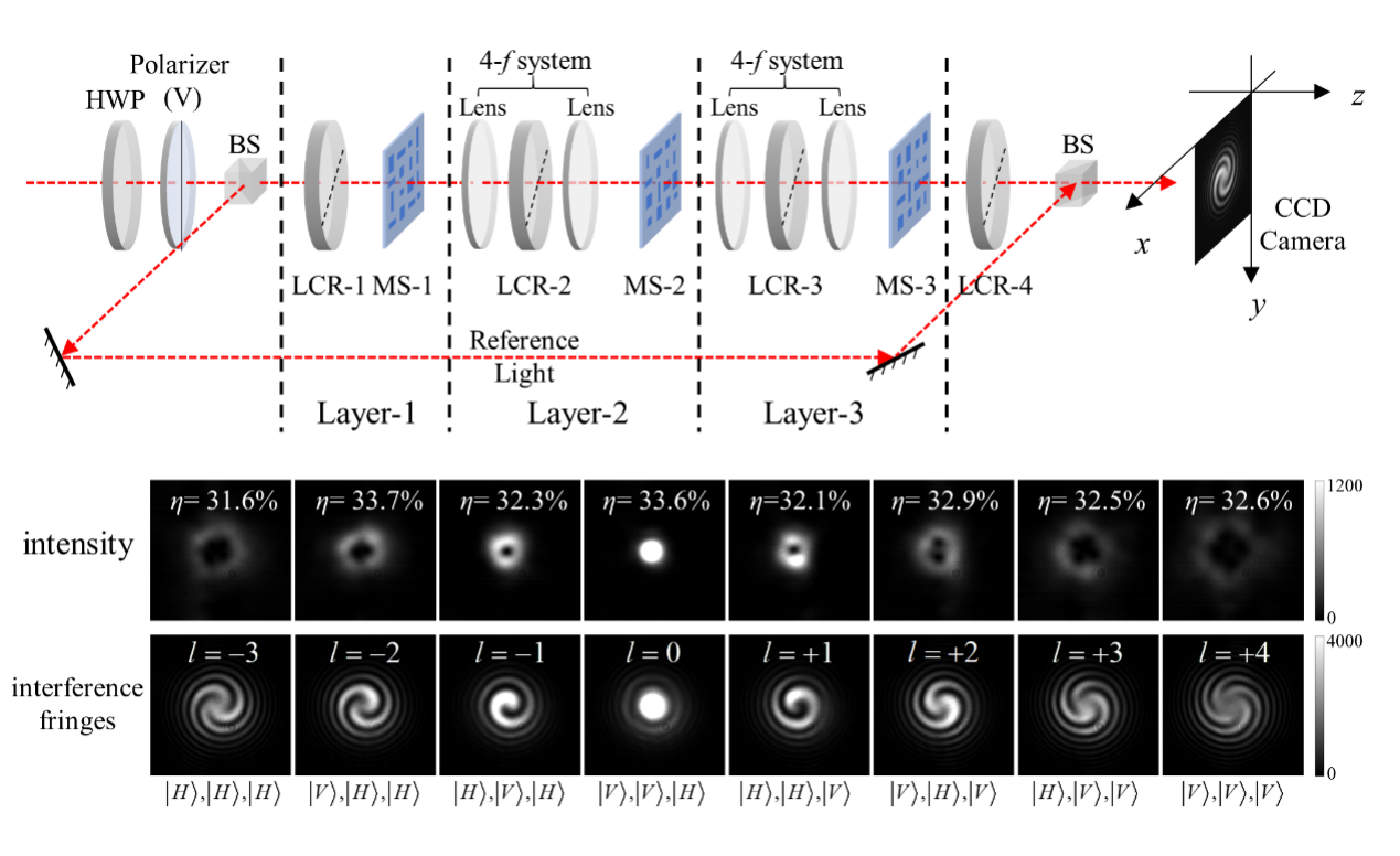 近日,清華大學電子工程系黃翊東教授團隊馮雪副教授的研究小組在超表面的多通道可調(diào)光場操控方面取得研究進展。他們提出了一種利用N層偏振相關(guān)超表面結(jié)合偏振控制器的級聯(lián)架構(gòu),將偏振相關(guān)超表面的可調(diào)通道數(shù)由2個提升至2N個,并且原理上無內(nèi)稟損耗和串擾,適用的功能包括動態(tài)波束偏轉(zhuǎn)、動態(tài)可調(diào)階次的渦旋光束產(chǎn)生、變焦超透鏡等。實驗上通過3層超表面結(jié)合液晶偏振延遲器的級聯(lián),實現(xiàn)了8通道可調(diào)階次的渦旋光束產(chǎn)生以及8通道動態(tài)波束偏轉(zhuǎn),同時支持電調(diào)切換,驗證了該架構(gòu)的可行性。