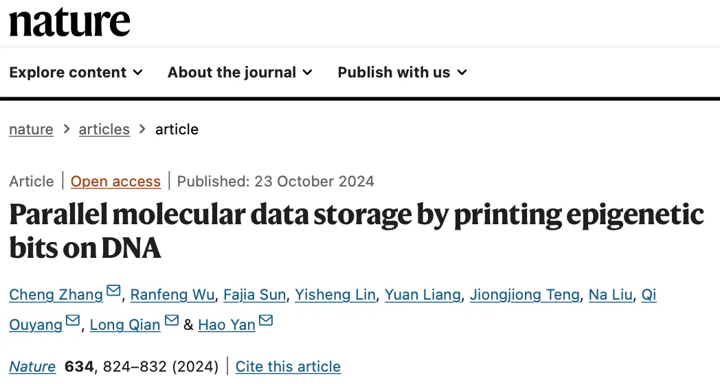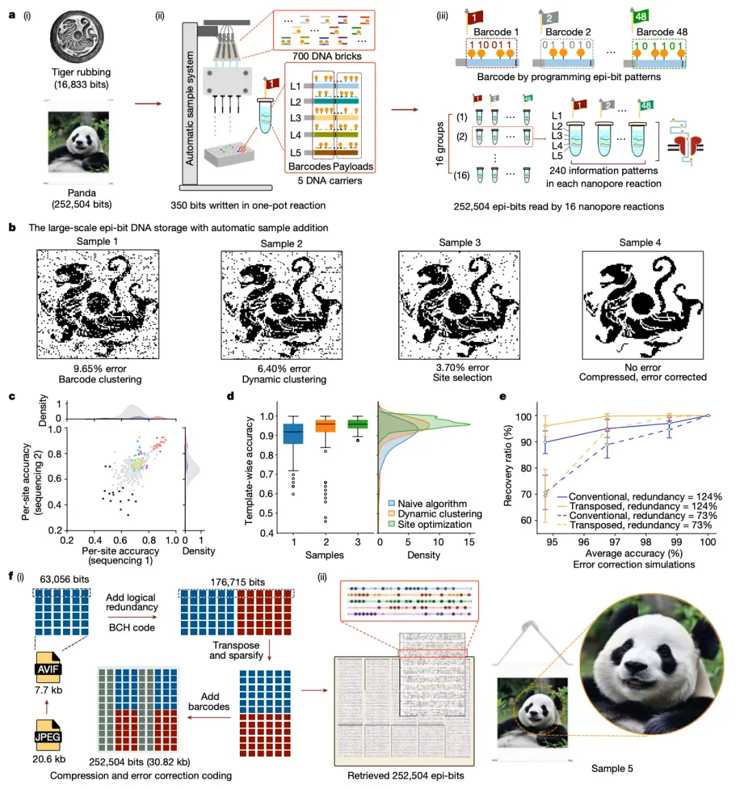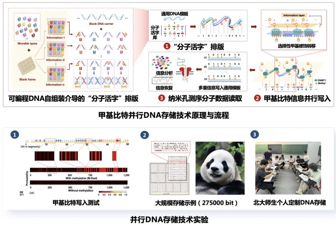 2024年10月23日,北京大學計算機學院張成與定量生物學中心錢瓏聯(lián)合研究團隊與合作者,在國際學術(shù)期刊Nature上發(fā)表題為“Parallel molecular data storage by printing epigenetic bits on DNA”的研究論文,首次提出了一種基于并行寫入策略的DNA存儲策略,成功將信息打印在DNA分子之上,猶如“活字印刷”,在白紙上批量印刷信息。團隊在實驗中,成功將中國漢代“白虎”瓦當和大熊貓的高清圖片(數(shù)據(jù)量超過27.5萬比特)寫入DNA分子中,并無損還原了原始數(shù)據(jù),解析出高清圖片。