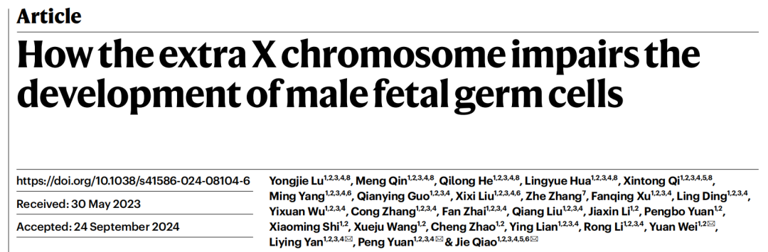 2024年10月30日,北京大學第三醫(yī)院婦產(chǎn)科喬杰/袁鵬/閆麗盈/魏瑗團隊合作在《自然》(Nature)發(fā)表了題為“How the extra X chromosome impairs the development of male fetal germ cells(額外的X染色體如何損害男性胎兒生殖細胞發(fā)育)”的研究文章。