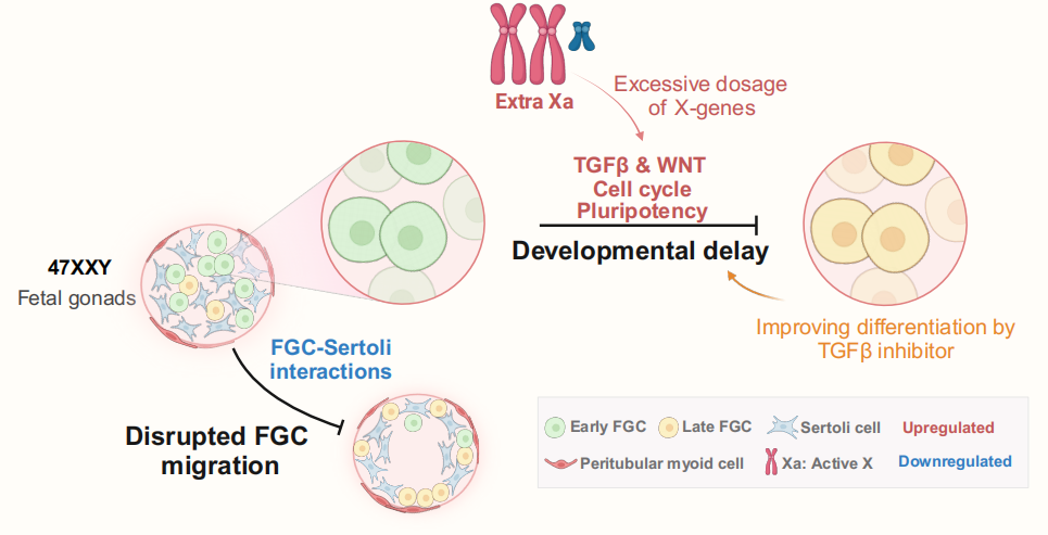 該研究以導致男性不育最常見的性染色體疾病——克氏綜合征(核型47,XXY)為代表,系統(tǒng)揭示了額外的X染色體導致男性胎兒生殖細胞(Fetal germ cell, FGC)發(fā)育異常的分子機制,并且發(fā)現(xiàn)了改善該類患者生殖障礙的潛在干預策略,為其不育癥的早期治療提供了理論依據(jù)。