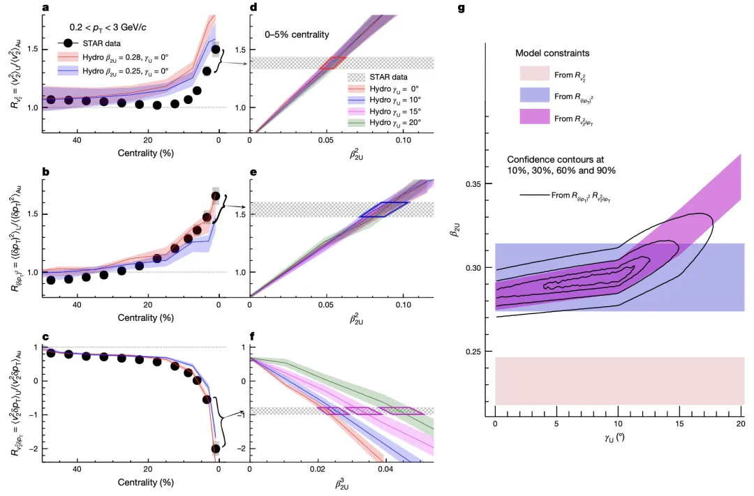 在《自然》論文中,馬余剛院士團(tuán)隊與合作者在STAR實驗組以接近球形的金核-金核碰撞為基準(zhǔn),精準(zhǔn)成像原子核結(jié)構(gòu)特征,定量提取了鈾核-鈾核碰撞中鈾-238原子核的四極軸對稱形變(β2)和三軸形變(γ)結(jié)構(gòu)信息。