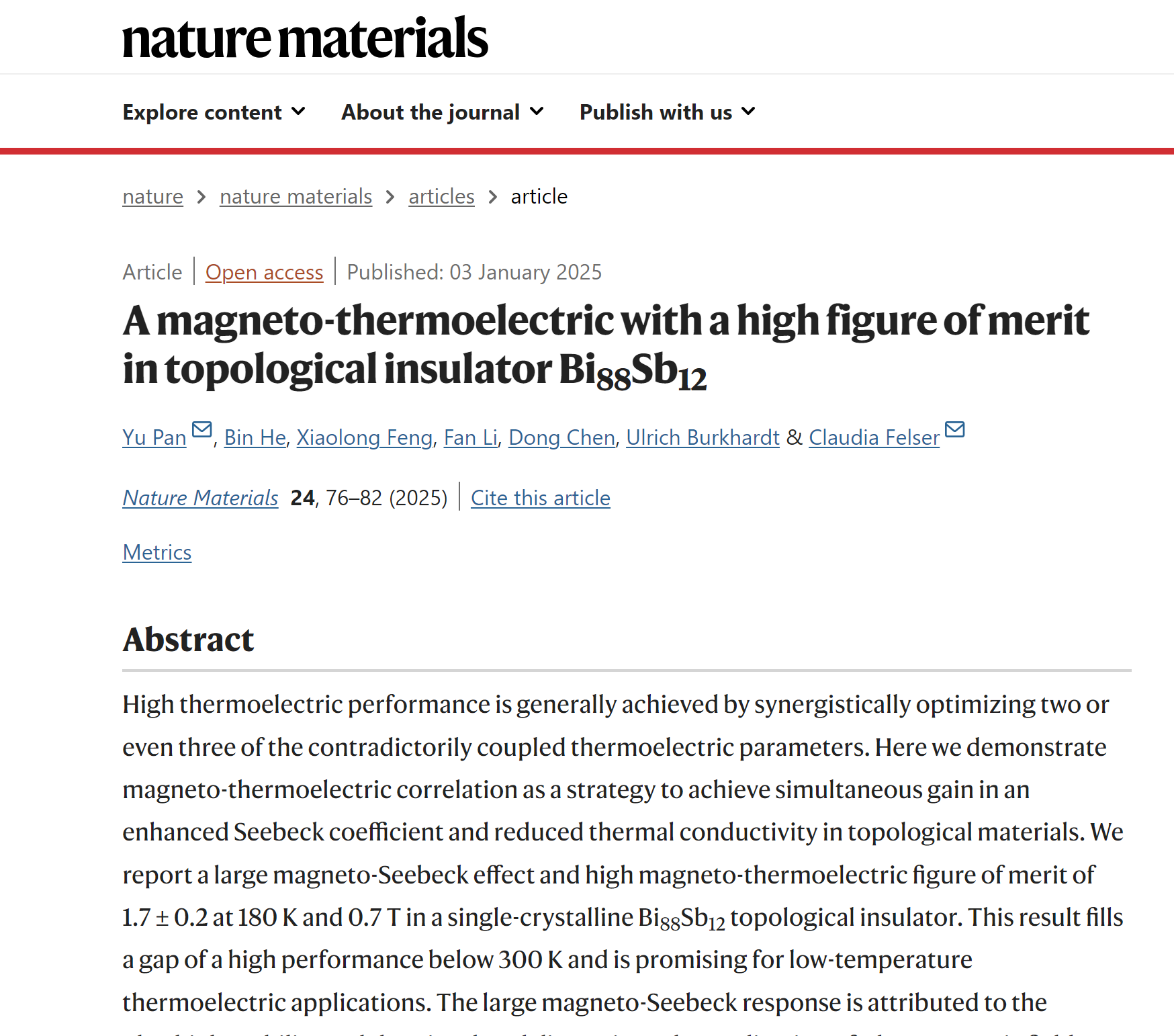 北京時(shí)間2025年1月3日,重慶大學(xué)前沿交叉學(xué)科研究院量子材料與器件研究中心、材料科學(xué)與工程學(xué)院潘瑜教授在國(guó)際頂級(jí)期刊《自然材料》(Nature Materials)發(fā)表最新研究成果。論文題目為《具有優(yōu)異磁-熱電優(yōu)值的Bi88Sb12拓?fù)浣^緣體》(A magneto-thermoelectric with a high figure of merit in topological insulator Bi88Sb12 )。潘瑜教授為第一作者、通訊作者,重慶大學(xué)為第二完成單位、通訊單位,德國(guó)馬普固體化學(xué)物理研究所為第一完成單位,合作單位還包括馬普微結(jié)構(gòu)物理研究所、重慶大學(xué)物理學(xué)院。