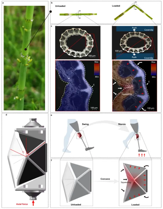 馬尾草是一種常見(jiàn)的具有管狀結(jié)構(gòu)的植物,這種植物有些可以長(zhǎng)到5米高,但是只有2厘米粗,如圖4所示,通過(guò)對(duì)其莖的截?cái)嗝孢M(jìn)行觀(guān)察,可以看到一個(gè)由薄的外環(huán)強(qiáng)化組織和更厚的內(nèi)環(huán)軟組織組成的結(jié)構(gòu),在馬尾草被彎折的時(shí)候,外環(huán)形成的管狀結(jié)構(gòu)受擠壓,使得內(nèi)部軟組織細(xì)胞內(nèi)壓上升,從而提高結(jié)構(gòu)剛度抵抗彎折。進(jìn)一步觀(guān)察可以發(fā)現(xiàn),在髓腔生長(zhǎng)過(guò)程中,管狀結(jié)構(gòu)內(nèi)壁上會(huì)形成褶皺結(jié)構(gòu),在結(jié)構(gòu)應(yīng)力最集中的部位,褶皺處會(huì)進(jìn)一步凹陷,擠壓局部細(xì)胞,使細(xì)胞內(nèi)壓進(jìn)一步上升,從而提高局部結(jié)構(gòu)強(qiáng)度。由此,本研究總結(jié)出馬尾草抗彎折的兩大關(guān)鍵機(jī)制,即流體壓制穩(wěn)定和受壓內(nèi)凹結(jié)構(gòu)。