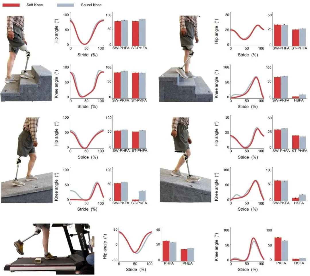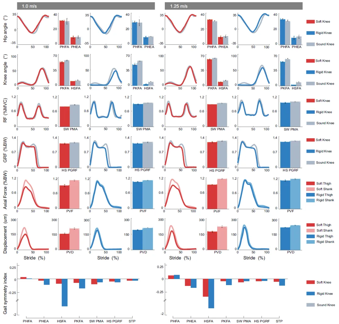 此外,本研究邀請(qǐng)三名殘疾人被試參加一系列行走實(shí)驗(yàn),如1 m/s和1.25 m/s跑步機(jī)行走、上、下15 cm臺(tái)階、上、下10°斜坡、跨越障礙等。圖6展示的是殘疾人分別穿戴軟體假肢和日常使用的剛性假肢在跑步機(jī)上以1 m/s和1.25 m/s的速度行走的實(shí)驗(yàn)結(jié)果,實(shí)驗(yàn)采集了殘疾人殘側(cè)和健側(cè)的關(guān)節(jié)角度、肌肉激活程度、足底壓力、假肢對(duì)地面沖擊力和振幅的的吸收,并進(jìn)行了步態(tài)對(duì)稱(chēng)性分析。結(jié)果表明,盡管殘疾人對(duì)軟體假肢不熟悉,仍可以穿戴軟體膝關(guān)節(jié)假肢以正常步速和較快步速進(jìn)行行走,并具有更好的步態(tài)對(duì)稱(chēng)性,殘疾人不僅更省力,受到的沖擊也更小,主觀(guān)上也認(rèn)為行走時(shí)的舒適度更高。