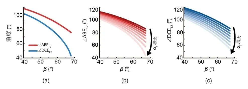 圖3. ABE12及DCE12在3D折紙結(jié)構(gòu)折展過(guò)程中的變化與α1、α2、β 的關(guān)系