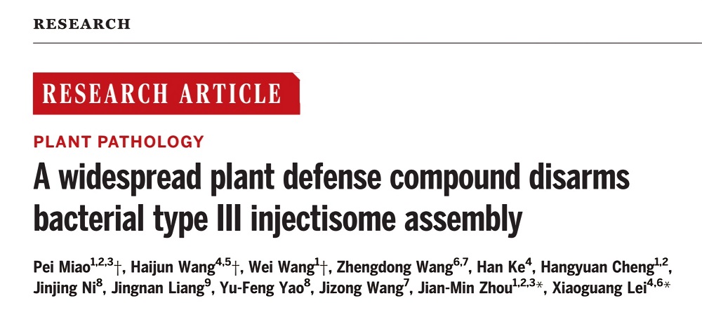 2025年2月28日,北京大學(xué)化學(xué)與分子工程學(xué)院/北大-清華生命科學(xué)聯(lián)合中心雷曉光教授團(tuán)隊(duì)聯(lián)合中國科學(xué)院遺傳發(fā)育所/崖州灣國家實(shí)驗(yàn)室周儉民研究員團(tuán)隊(duì)在Science上發(fā)表了題為“A widespread plant defense compound disarms bacterial type III injectisome assembly”的研究論文(Science 2025, 387, eads0377),首次揭示了一類植物內(nèi)源存在的、具有作用機(jī)制獨(dú)特、廣譜抗菌活性的天然產(chǎn)物分子——芥酸酰胺。研究表明,芥酸酰胺通過特異性破壞植物病原細(xì)菌的三型分泌系統(tǒng)(T3SS)組裝,有效抑制其致病力,從而實(shí)現(xiàn)對(duì)多種細(xì)菌侵染的廣譜抑制作用。這一機(jī)制體現(xiàn)了“不戰(zhàn)而屈人之兵”的創(chuàng)新抗菌策略,與傳統(tǒng)抗生素藥物相比具有顯著優(yōu)勢(shì):芥酸酰胺不直接殺滅細(xì)菌,而是選擇性地降低病原菌的致病力,這種獨(dú)特的作用模式不僅確保了更高的生物安全性,還顯著減少了對(duì)環(huán)境的污染風(fēng)險(xiǎn),同時(shí)有效規(guī)避了細(xì)菌耐藥性的產(chǎn)生。這一重大科學(xué)發(fā)現(xiàn)為新型生物農(nóng)藥的研發(fā)開辟了全新路徑,對(duì)推動(dòng)綠色農(nóng)業(yè)可持續(xù)發(fā)展具有重要的理論和實(shí)踐意義。